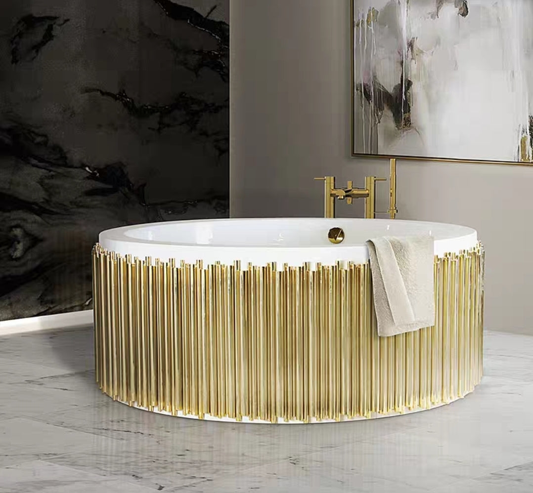 Introducing the round edition of our Aurora Soak Tub — where sculptural form meets spa serenity. This golden showpiece is clad in vertical brass piping that reflects light like ripples on water, surrounding a deep, circular white basin for immersive soaking.