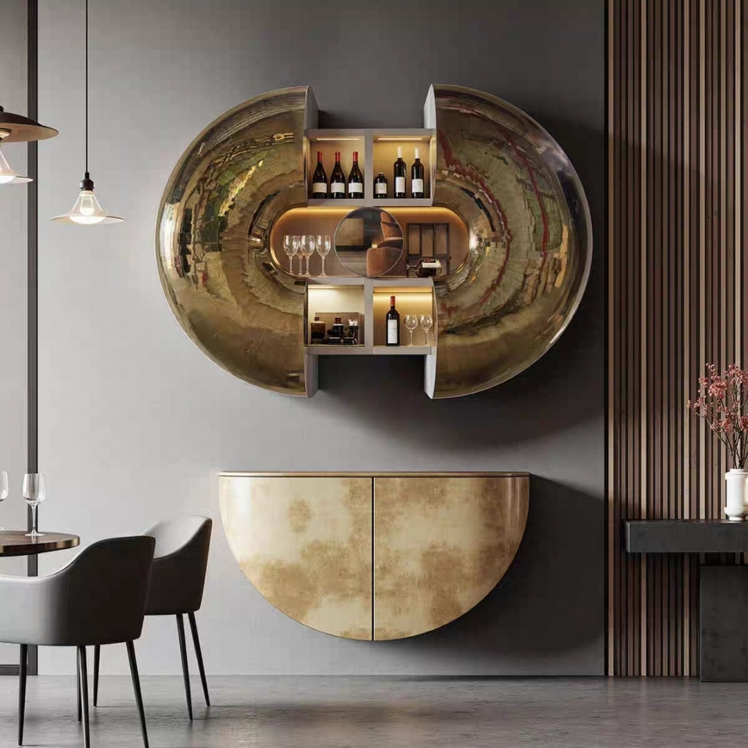 A futuristic blend of sculpture and utility, this circular wall-mounted mirror transforms into a hidden bar with a push. Designed with a high-polish metallic finish and intricate folding mechanism, it's both an artistic statement and a conversation-starting storage piece.