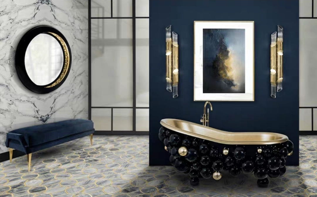 An unapologetically bold centrepiece — this sculptural black and gold tub turns every soak into a statement.