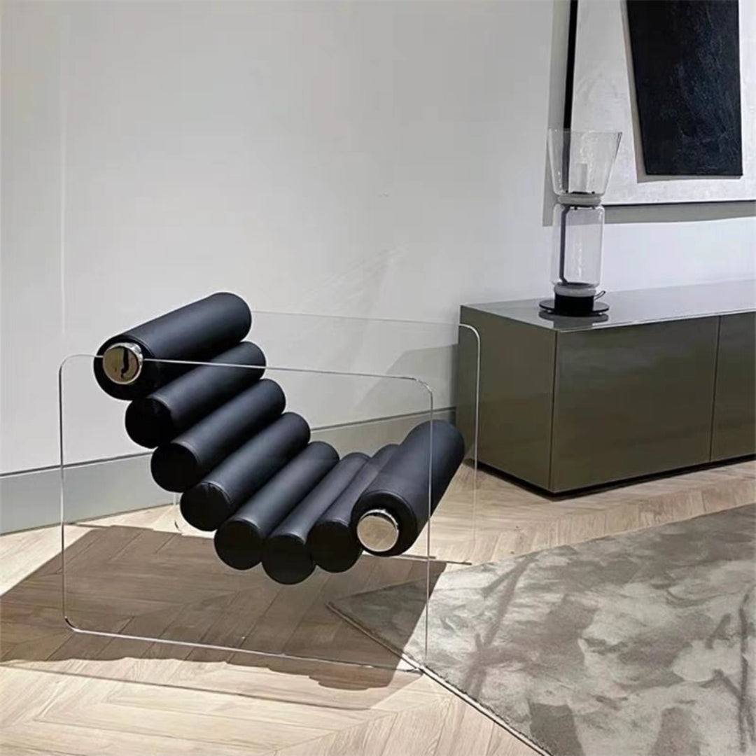 Elevate your interior with the Lucent Form Chair — a bold interplay of futuristic design and plush comfort. Featuring a transparent acrylic frame, polished stainless accents, and velvet-textured cylindrical cushions, this sculptural piece merges innovation with indulgence.