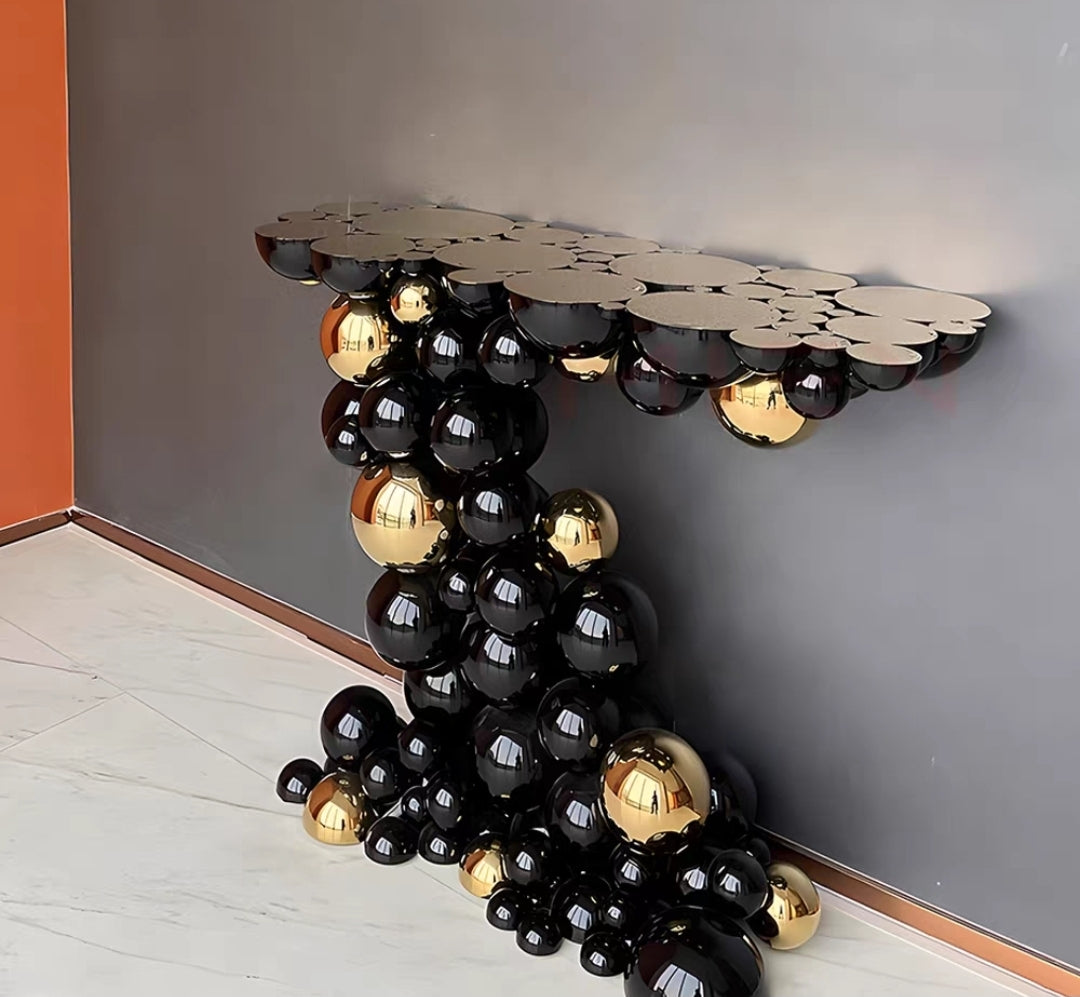 Make a bold entrance with this one-of-a-kind sculptural console table — a true statement of modern artistry. Crafted in a studio environment using hand-welded stainless steel spheres, each piece is formed and polished by skilled artisans over a 30-day process, giving every table its own unique personality.